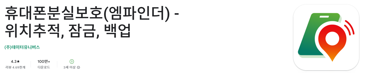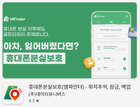 휴대폰분실보호(엠파인더) - 위치추적, 잠금, 백업 는 (주)데이터유니버스에서 제공하는 안드로이드용 분실폰 보호 서비스로, 휴대폰을 잃어버렸을 때 위치추적과 잠금, 데이터 백업, 원격 제어 등의 기능을 통해 회수 가능성을 높여 주는 도구입니다. 이 앱은 휴대폰 분실 전부터 설치 및 설정을 해 두어야 기능을 정상적으로 활용할 수 있습니다.