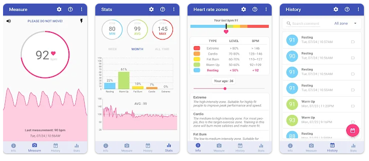 이 앱은 단순한 측정 기능뿐만 아니라 결과를 기록하고 시각적으로 표시하는 통계 UI를 제공하며, 추가적으로 CSV 내보내기나 심박수 영역 계산 등 다양한 건강 관리 도구를 포함하고 있습니다. 특히 운동 중 목표 심박수 영역을 확인하고 싶을 때 유용하게 활용할 수 있습니다.