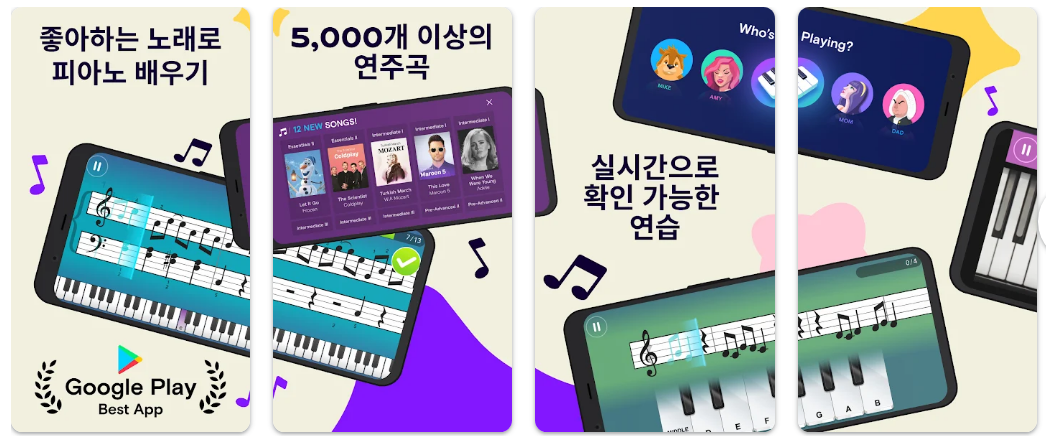 특히 실제 피아노나 키보드와 함께 사용할 수 있고, 사용자가 연주하는 음을 앱이 인식해 즉시 피드백을 제공하기 때문에 혼자 연습하는 환경에서도 체계적인 학습이 가능합니다. 또한 다양한 인기곡과 클래식 음악을 활용한 연습 과정이 포함되어 있어 재미있게 연습할 수 있도록 구성되어 있습니다.